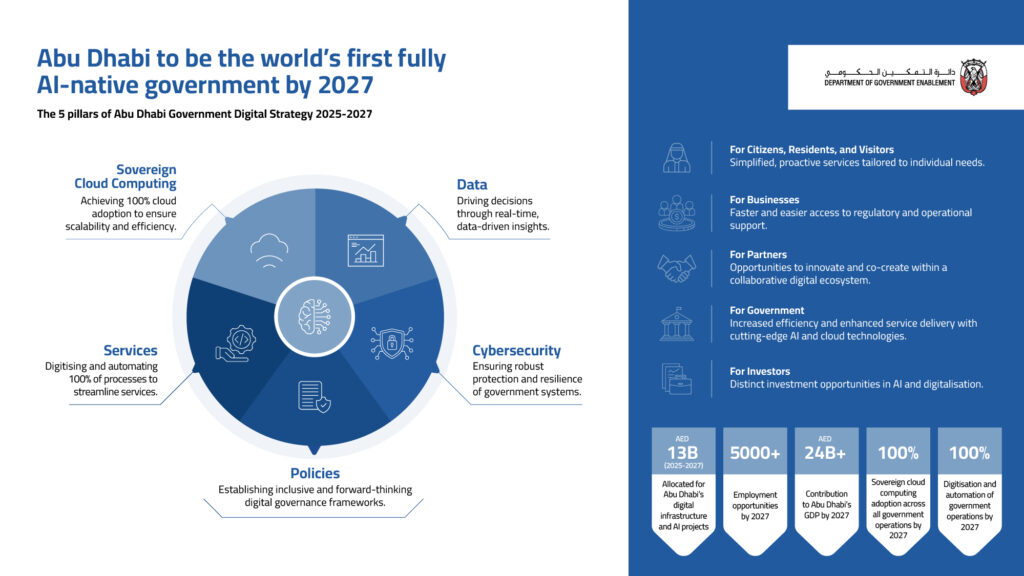 The Abu Dhabi Government has announced the "Abu Dhabi Government Digital Strategy 2025-2027," advancing the emirate’s transformation towards an AI-powered government. Implemented by the Department of Government Enablement – Abu Dhabi (DGE) in collaboration with Abu Dhabi government entities, the strategy aims to position the emirate as a global leader in AI-drivengovernment and will allocate AED13 billion through 2025-2027to foster innovation and technology adoption in the emirate.